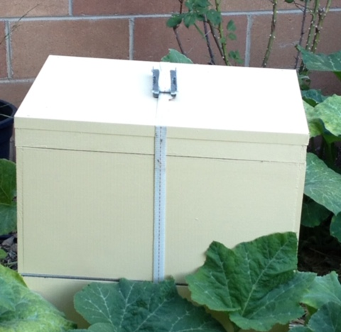 There are several different types of hives available that can help you in keeping bees and managing their hive. Langstroth hives are the traditional hives with 9 or 10 frames in boxes (frames like in the picture above). Here’s my nestled in amongst my pumpkin vines (amazing pollination that year). Generally a Queen Excluder is used to separate the brood box from the honey box, making collection easier on the humans managing the hive.